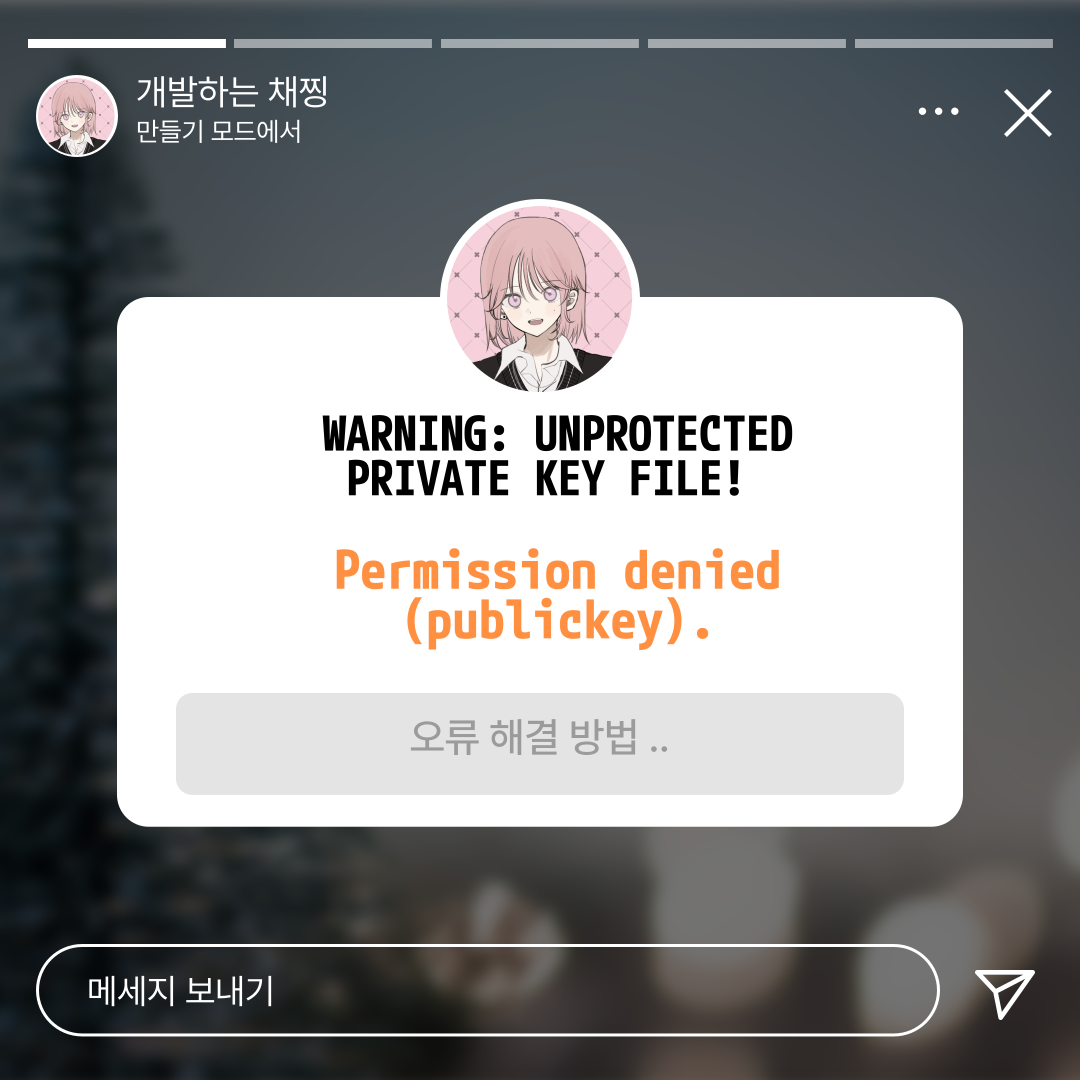 | 😱 오류내용 pem key를 이용한 터미널 접속시 아래 와 같은 오류 발생 [첫번째] Warning: Identity file [key name].pem not accessible: No such file or directory. | 🚀 현상 키를 이용하여 터미널에 접속하기위해 아