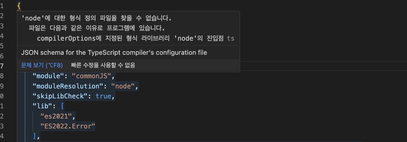 tsconfig.json 파일에서 JSON schema for the TypeScript compiler's configuration file 오류가 발생하고 있었습니다.