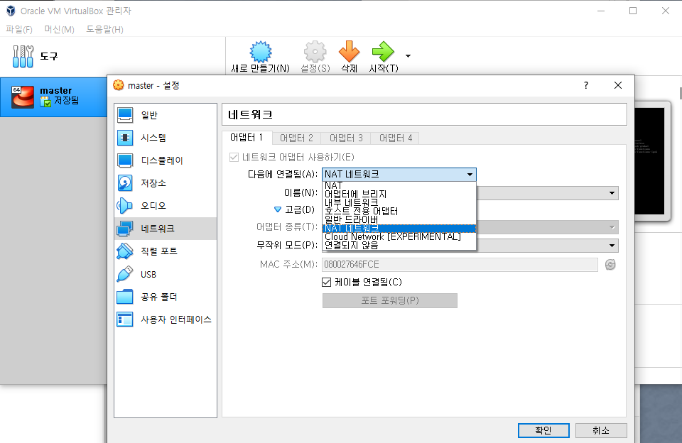 네트워크 설정을 NAT네트워크로 변경하면 NatNetwork가 세팅하고 확인을 눌러줍니다.