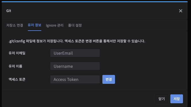 유저정보 를 선택하여 git 이메일, 유저이름, 액세스 토큰을 작성해줍니다.