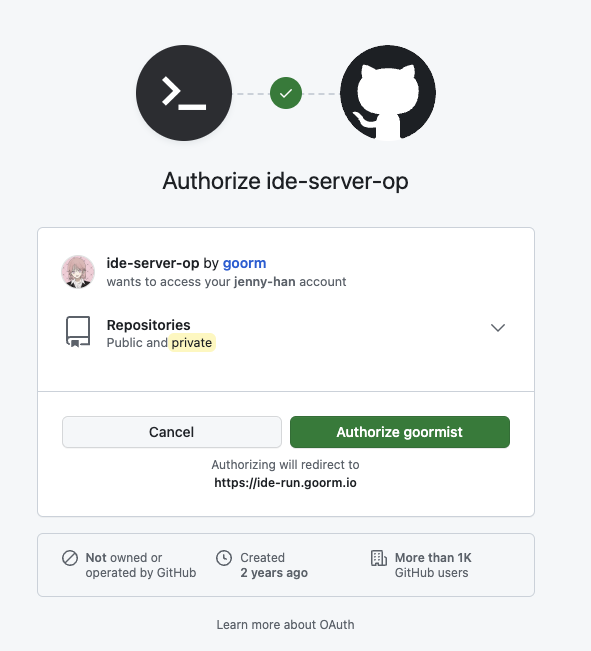 Authorize goormist 를 선택하고 비밀번호를 눌러 연결해줍니다
